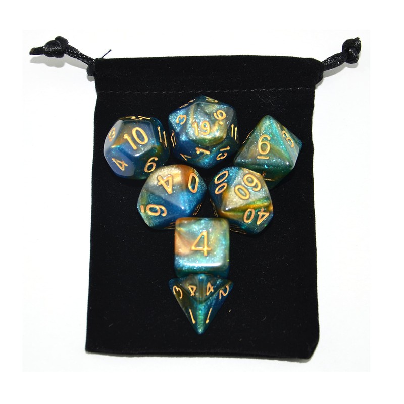 - You will receive a 7-Die dice set with 1 small pouch. A single 7-die set contains one d20, one d12, two d10 (00-90 and 0-9), one d8, one d6, and one d4.