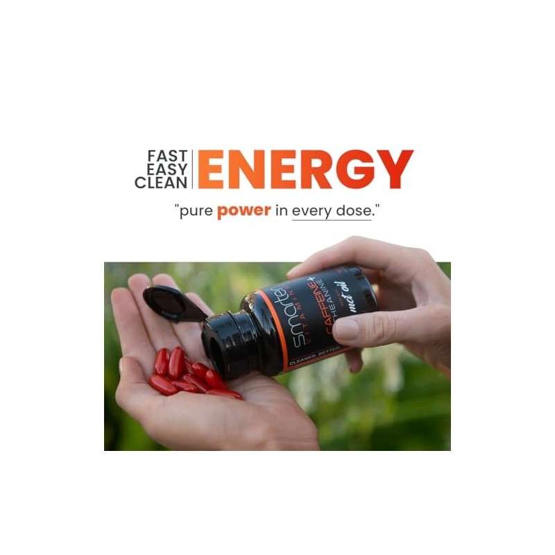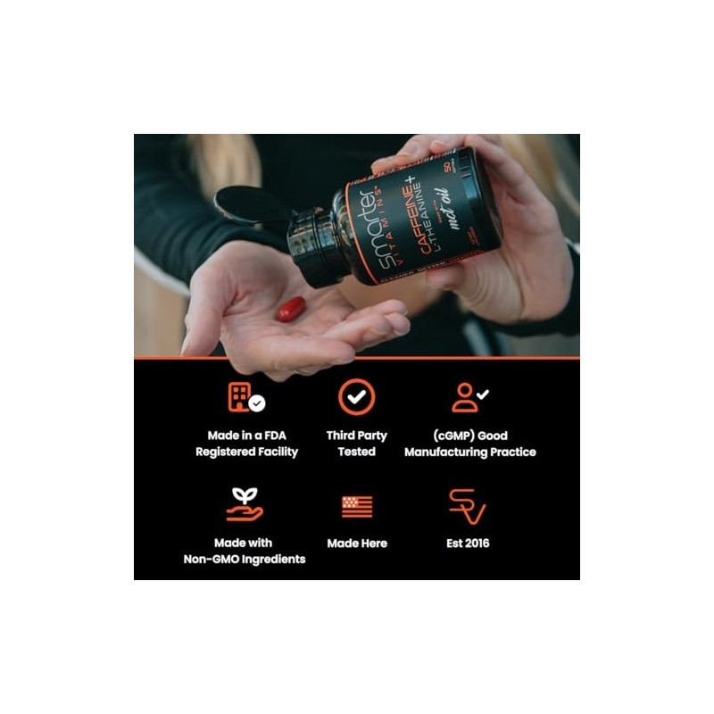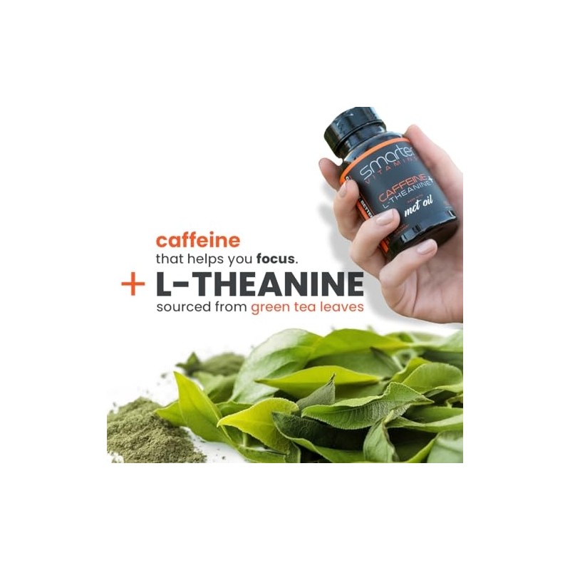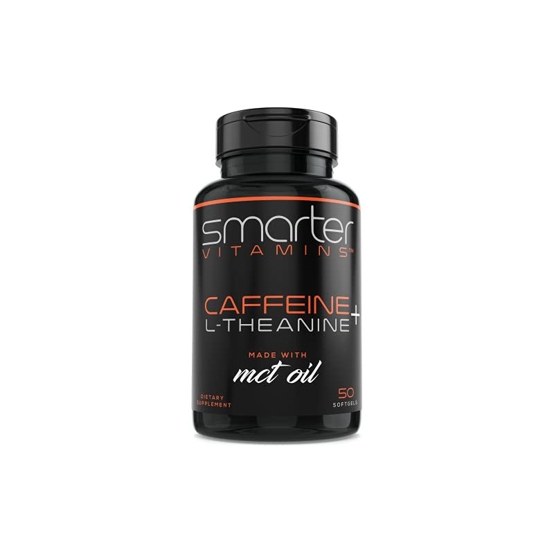 SmarterVitamins 200mg Caffeine Pills - MCT Oil from 100% Coconuts + 100mg L-Theanine, Energy and Focus, Extended Release Capsule, 50 Liquid Softgels