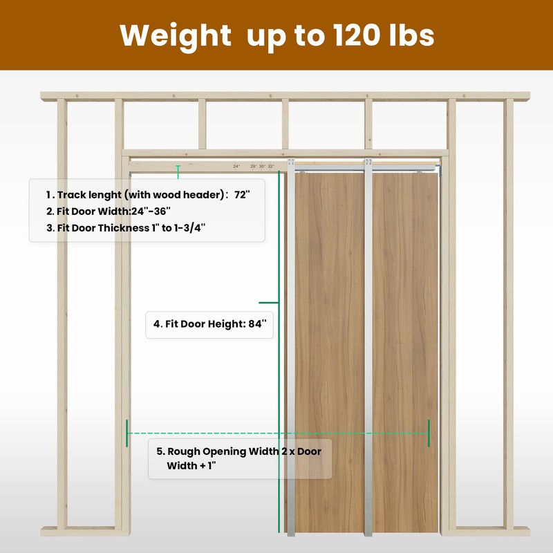 • Specifications: The pocket door kit is compatible with door thicknesses ranging from 1" to 1-3/4". Door width can vary from 24" to 36", and the door height is 84". The track is adjustable and can be trimmed to fit various opening sizes, as we also mark the key sizes on the wood header. If you need to fit a shorter door, the studs can also be cut