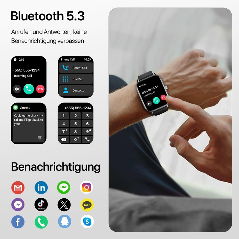 - ✅【Bluetooth-Anrufe & Sofortige Benachrichtigungen – Immer Erreichbar, Auch Ohne Handy】 Dank integriertem Mikrofon und Lautsprecher tätigen oder empfangen Sie Anrufe direkt über die Uhr – eine besonders praktische Funktion für jede moderne Smartwatch Herren Android. Benachrichtigungen von WhatsApp, SMS oder Facebook erscheinen direkt am Handgelenk. Perfekt für vielbeschäftigte Männer, die eine leistungsstarke Pulsuhren Herren mit smarten Funktionen suchen.