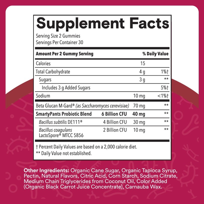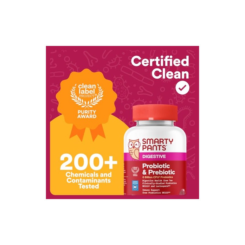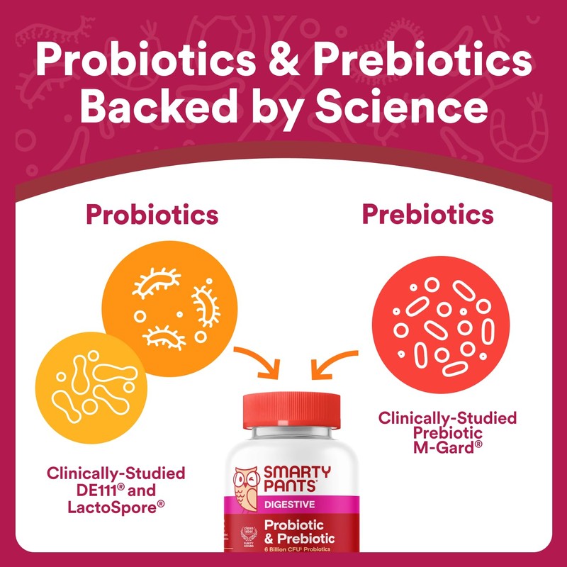 • SCIENCE-BACKED PROBIOTIC & PREBIOTIC GUMMY SUPPLEMENT FOR ADULTS: SmartyPants Probiotic & Prebiotic is a multi-strain probiotic and prebiotic supplement with clinically-studied DE111 to support a balanced gut microbiome, immune system, clinically-studied LactoSpore for digestive health, as well as clinically-studied prebiotic M-Gard.*
