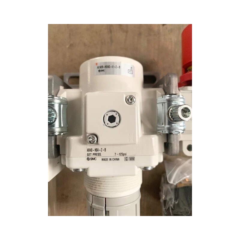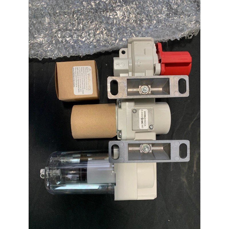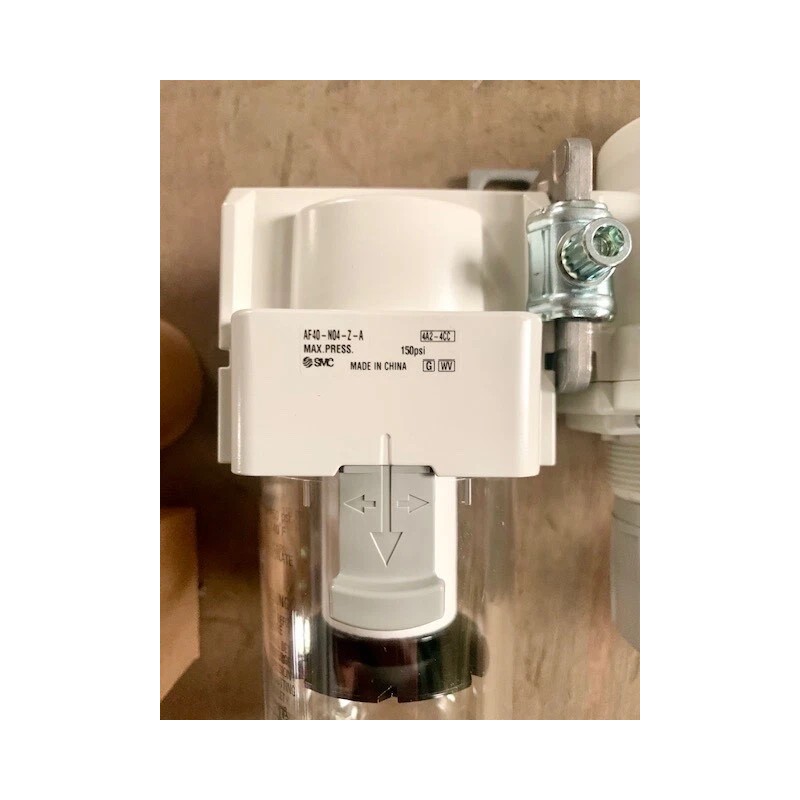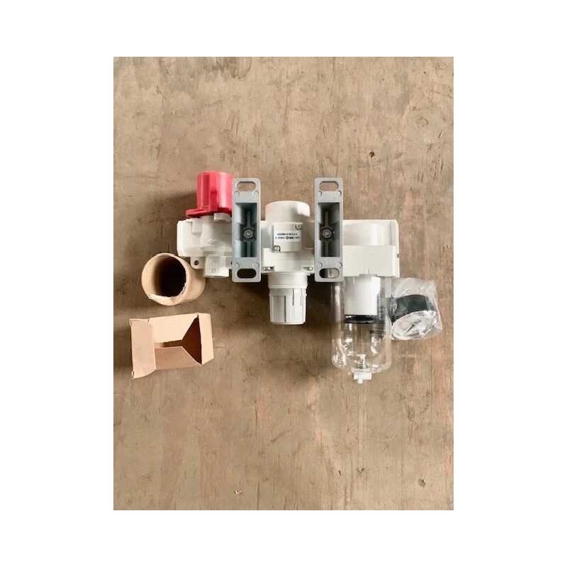 This listing is for a brand new SMC air preparation assembly, fully factory-assembled and never used. It includes the AC40B-N04E-V-G inline air-line filter, along with three additional high-performance SMC regulator and drain components: