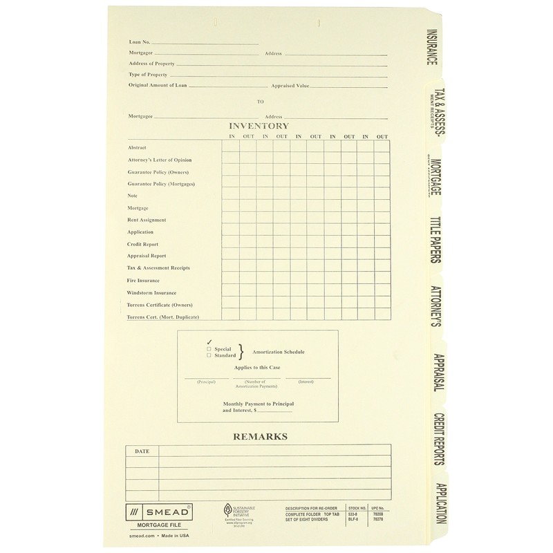 25 pt. pressboard cover contains eight 11 pt. Manila dividers (Insurance, Tax & Assessment Receipts, Mortgage, Title Papers, Attorney's Opinion, Appraisal, Credit Reports, Application). Front divider is printed with a form for mortgage applicant's information and inventory checklist. Includes jacket for papers that cannot be punched. Matching color Tyvek tape. Includes flat metal tab and insert, and fastener compressor. Classification Folder Type: Mortgage; Size: Legal; Number of Sections: 8; Cover Material(s): 25 pt. Pressboard.