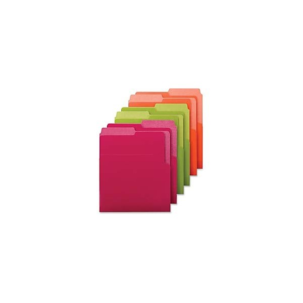 Smead Vertical File Folder, Ltr, ASMT2, 6/PK, AST Bright Tones. Heavyweight vertical file folders let you file and organize your documents upright like you print and read them. These super durable, heavyweight water-resistant files stand up to extensive use. The dual-tab lets you label the file for both vertical and horizontal use—perfect for desktop, backpacks and drawers. Closed on two sides for extra security. Scored on the front for easy access to papers. File Folder Size Type: Letter; File Folder Color: Assorted; Color Family: Multicolor; File Folder Color Assortment: Fuchsia; Orange; Peridot Green.