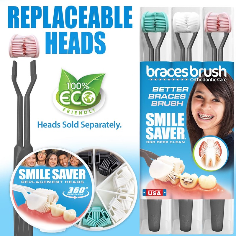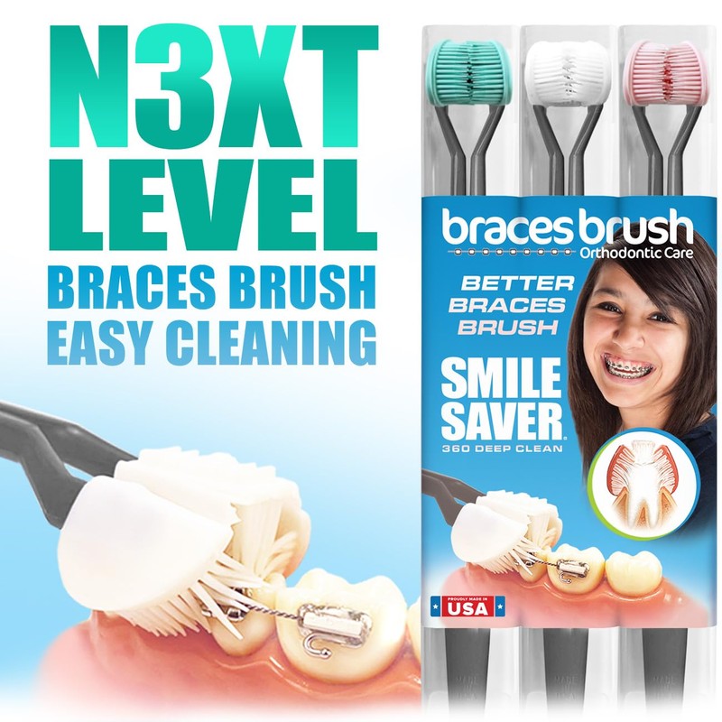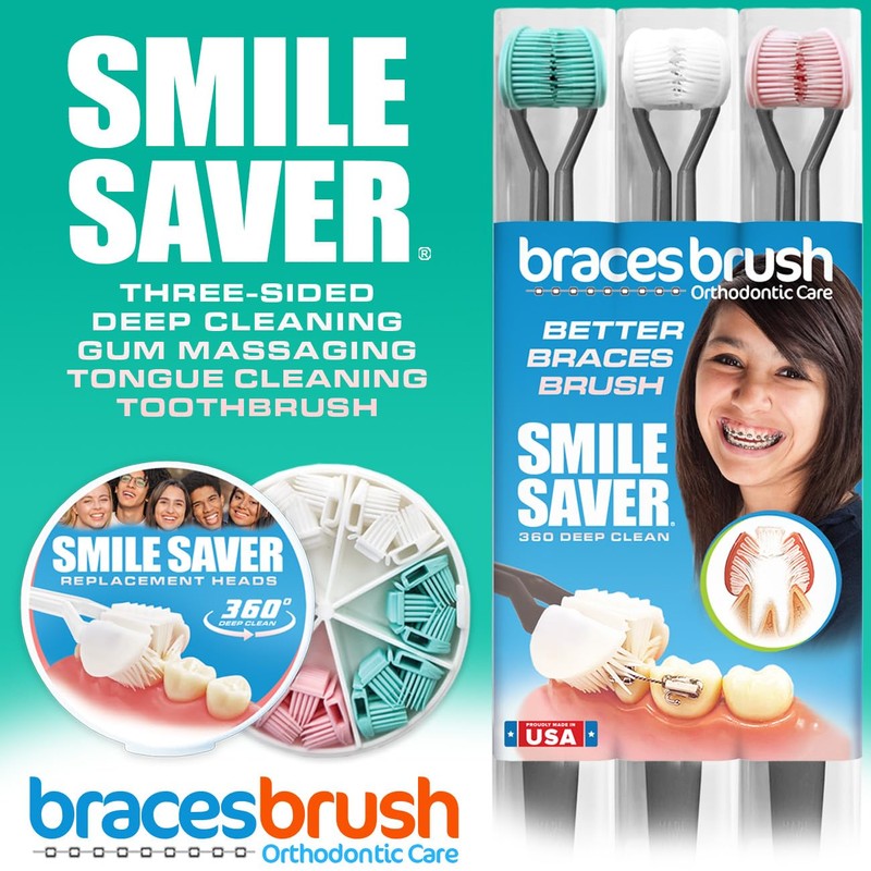 Braces and Orthodontics: The SMILE SAVER 360° 3-Sided Toothbrush is clinically proven to significantly reduce both plaque and gingivitis for people with Braces. It is the fastest and easiest way to complete dental care around orthodontic brackets, offering benefits far beyond the limitations of ordinary toothbrushes.
