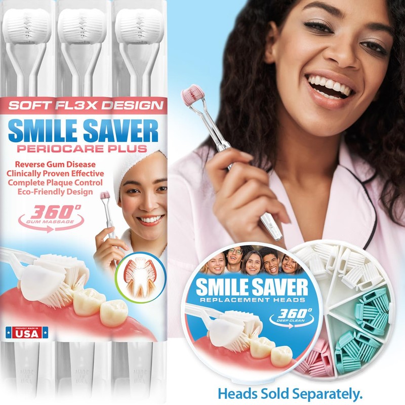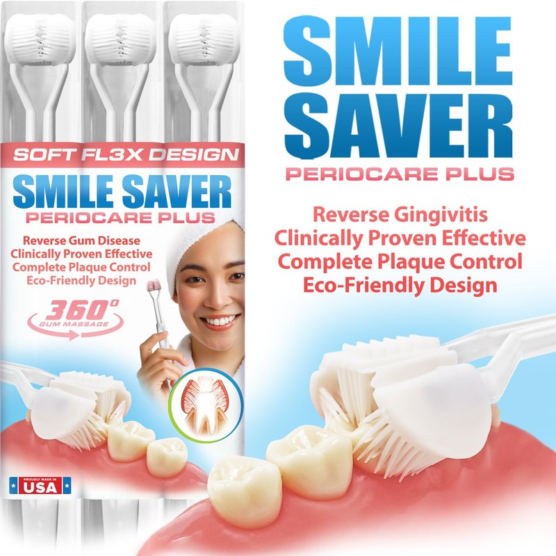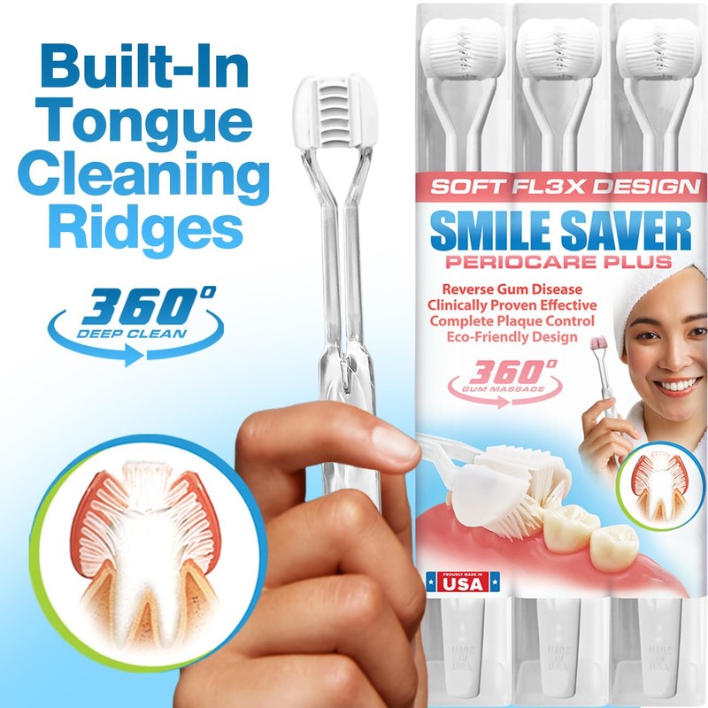Smile Saver 360° Periocare 3-Sided Toothbrush for Gum Health Massage Therapy | Sustainable U-Shaped Triple Perio Sensitive Soft Bristle Heads + Tongue Scraper Fresh Breath (White Heads - Firm)