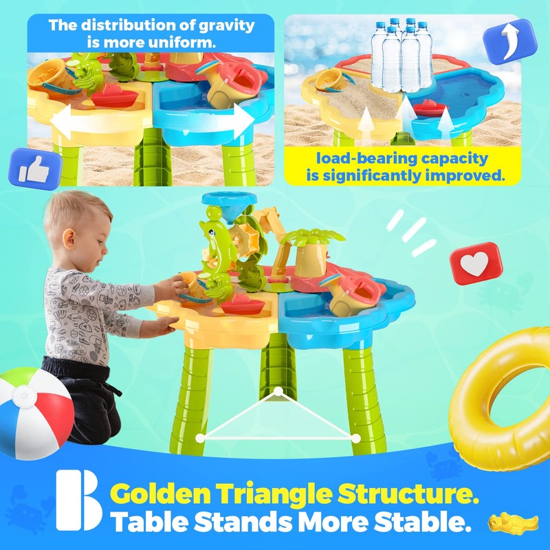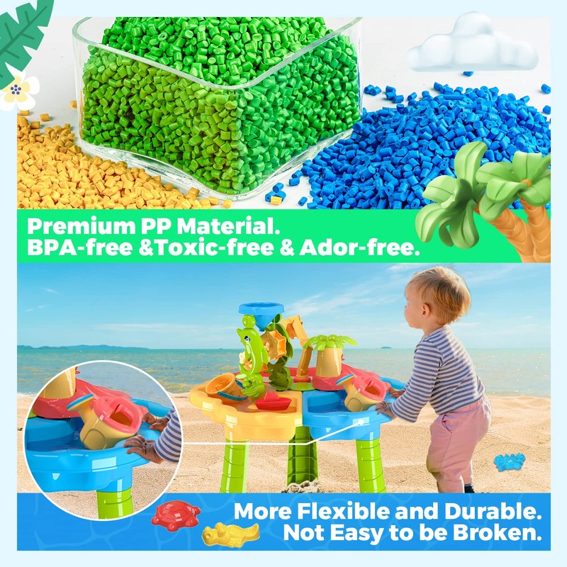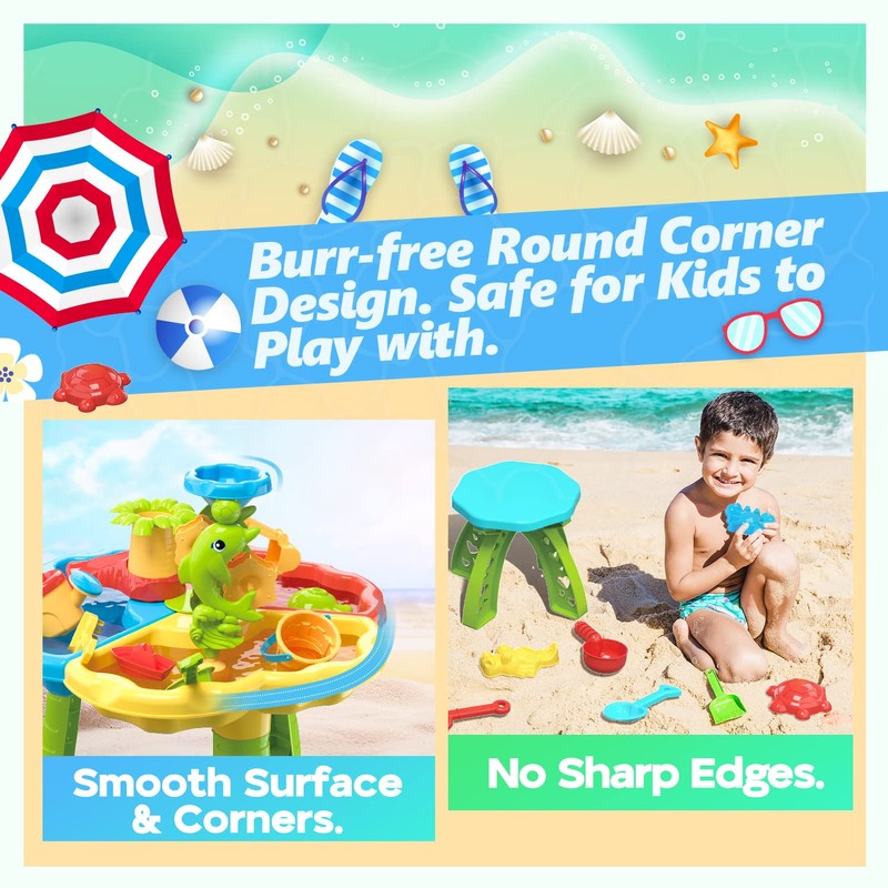 - Abundant Accessories for Endless Fun - The sand box includes over 15 cute accessories such as, dolphin funnels, water mills, water towers, excavators, boats, cans, shovels, spoons, crabs, and turtles. Accessories of toddler water table are designed with smooth edges, it is a safe outdoor toys for toddlers and provide endless fun.