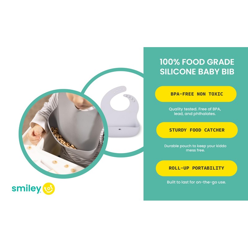 SmileyTots silicone baby bib is made with a durable food catcher. Free of BPA, phthalates, and lead. SmileyTot bibs are made with 100% silicone that is dishwasher and microwave friendly. SmileyTot silicone baby bibs are designed with a roll-up feature for easy and secure portability. This waterproof and adjustable baby bib keeps your baby or toddler clean and without mess!