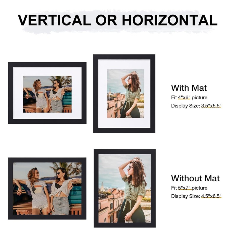 - Precise Dimensions: Our 5x7 picture frame can display pictures either horizontally or vertically. It accommodates 4x6 photos with the mat and fits 5x7 photos without the mat