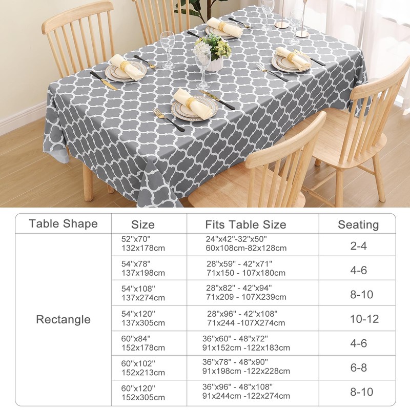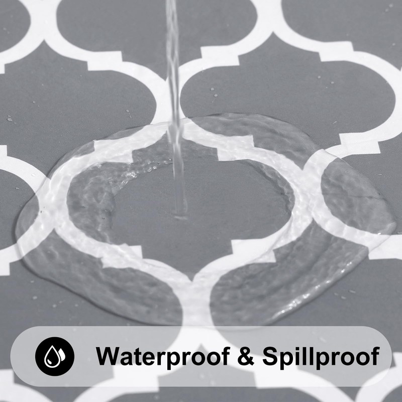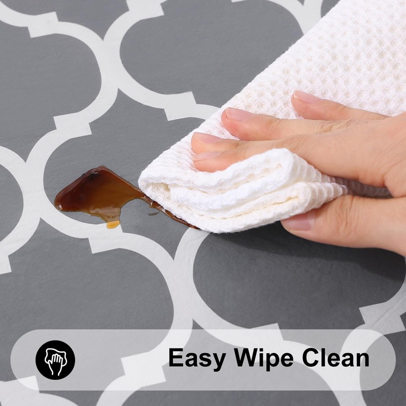 - [Waterproof and Wipe Clean] The waterproof vinyl surfaces insulate our table cloths from water, milk, oil and other stains. Just rub with a damp cloth or sponge to remove the stain and look fresh.