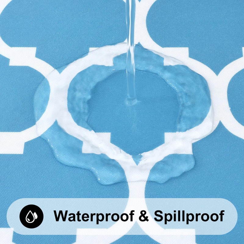 - [Waterproof and Wipe Clean] The waterproof vinyl surfaces insulate our table cloths from water, milk, oil and other stains. Just rub with a damp cloth or sponge to remove the stain and look fresh.