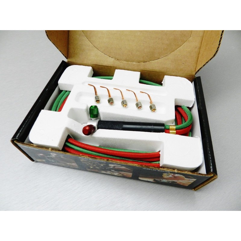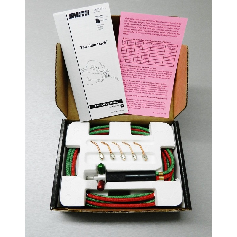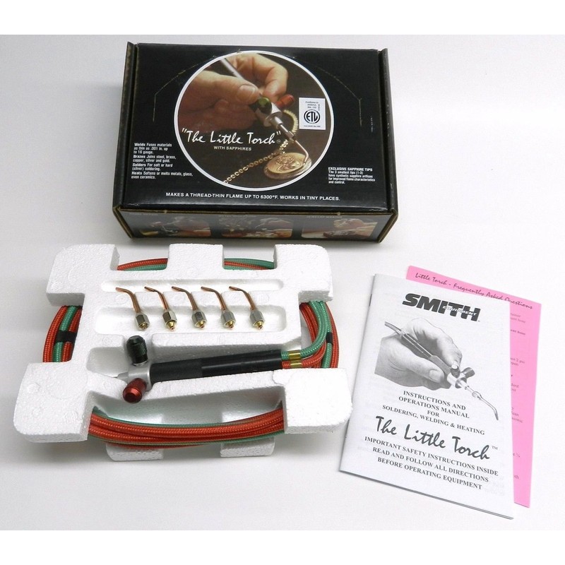 Smith Little Torch For Jewelry Repair, Manufacture, Hobby, Crafts, Electronics Repair, Metal Sculpture, Plumbing and Glass Blowing This is a new Little Torch. Smiths Little Torch welds an unlimited range of materials, brazes and solders the tiniest elements with ease, yet produces enough heat to weld steel up to 1/8" thick or melt 3 oz. of silver. Infinite Control Weighing only 1.5 ounces, The Little Torch is easily maneuvered in areas impossible to reach with conventional torches. Variety of Flame Settings and Sizes Produces a perfectly controlled, stable flame hot enough to melt commercially weldable metals, glass and ceramics with thread-thin flames up to 6000 degrees F. Unmatched Flexibility Works with any commercially used fuel gas, and strong, flexible hoses connect to any standard pressure regulator. When you pick up The Little Torch, you know immediately that you are holding a magnificent instrument which will enable you to extend your skills far beyond all previous limits. Whether you are in the first stages of learning your craft or have mastered it completely with more limited tools, The Little Torch will open a new world of possibilities for you. This superbly balanced torch with a rugged aluminum alloy body weighs only 1.5 ounces. The Little Torch features a thin, extremely lightweight hose which provides added maneuverability. In short, The Little Torch is designed to meet the most exacting industrial standards for a small, multipurpose torch. The Little Torch has unmatched flexibility -- it can be used with several fuels including acetylene, hydrogen, propane, propylene, Mapp, or natural gas. It produces a perfectly controlled, completely stable flame hot enough to melt commercially weldable metals, glass and even ceramics. The included tips provide a wide range of flame lengths and heat output for various metals and thickness. The operator can vary the flame length to his/her exact requirements by adjusting the oxygen and fuel ga