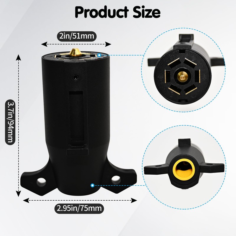 - Portable Size: The size of the 7-way RV connector is about 9.4 x 7.5 x 5.1cm/3.7 x 2.95 x 2.01inch(Lx W x H), convenient for carrying and storage. Whether placed in the toolbox or hung on the frame, it won't take up too much space
