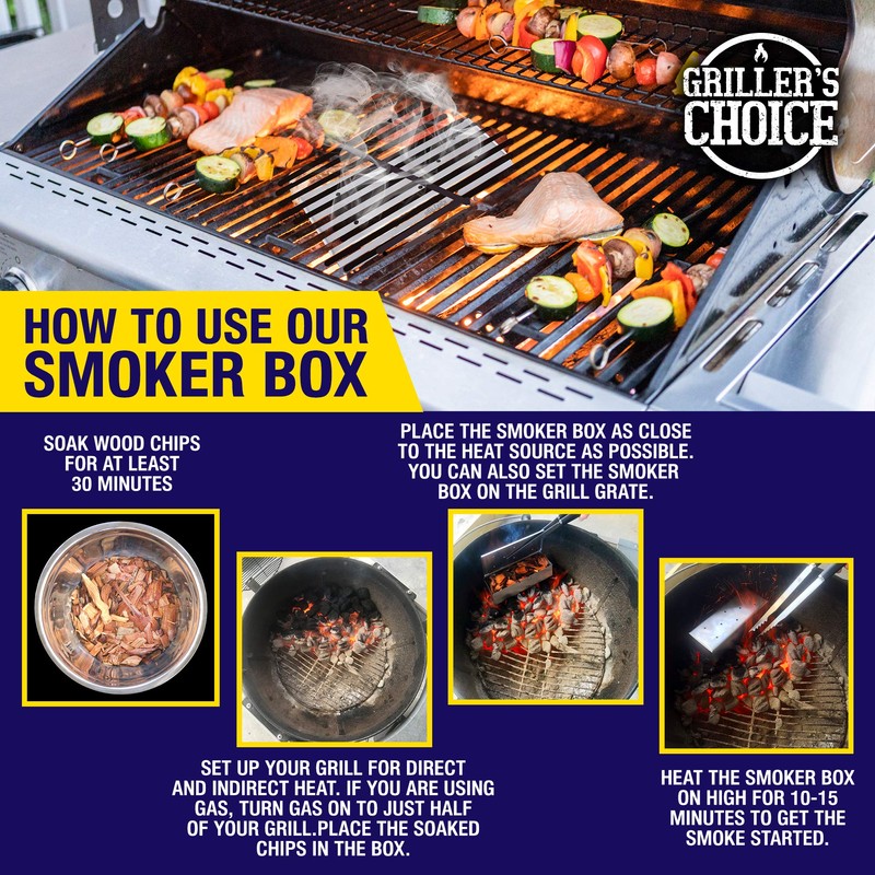 • COMMERCIAL QUALITY - Stainless steel chip box can be used with charcoal, gas or wood. Designed with the right amount of holes to give the best flavor profile.