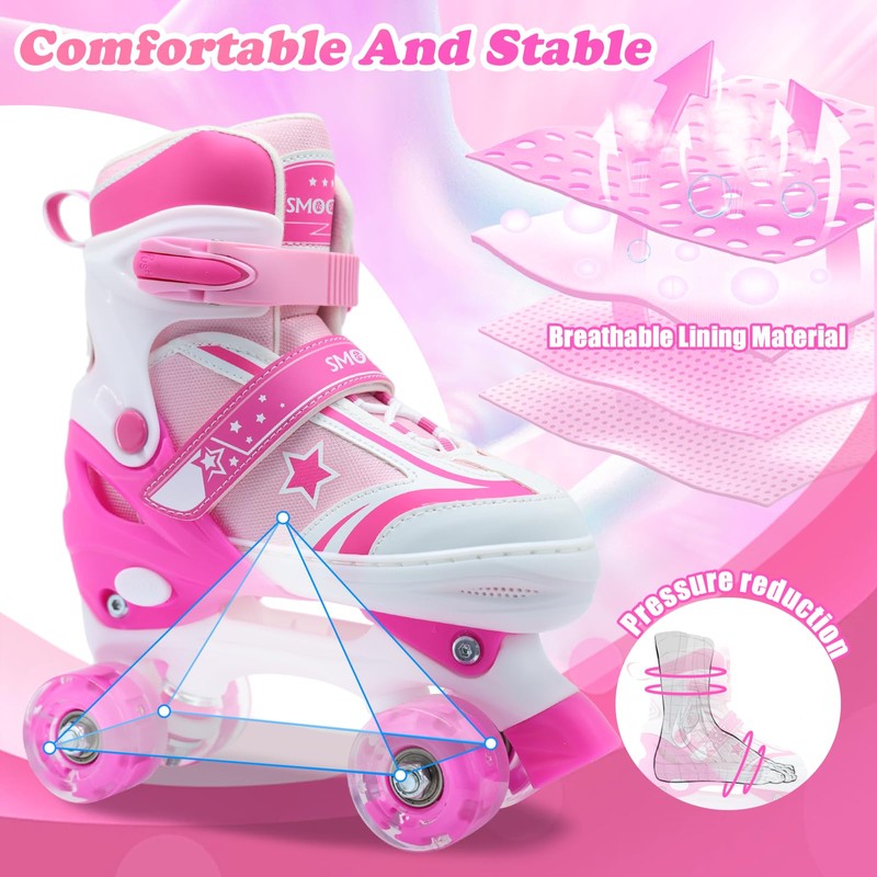 - 「8 Wheels Illuminating」 Roller skates for kids featuring 8 fully flashing PU wheels! Every skate session with SMOOJOY is a dazzling journey!
