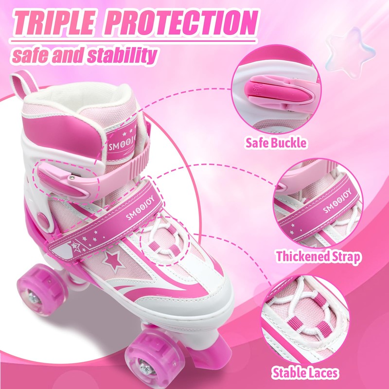 - 「Triple Safety Protection」 with Boys and Girls Roller Skates! Equipped with a ratchet buckle, power strap, and lace-up system, ensuring optimal stability and support. Brake-equipped skate toes provide added safety and control. With SMOOJOY, safety is top priority, allowing your child to skate with confidence.