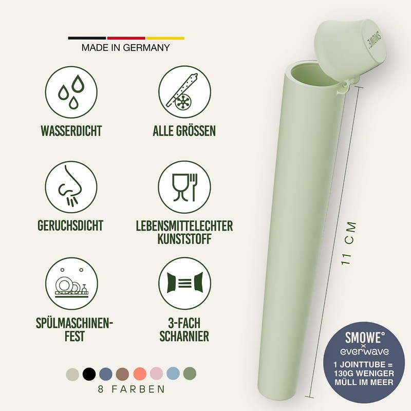 Germany. The GREENCONE° is a premium joint case that impresses with its soft-touch feeling, food-safe material and a strong 3-way hinge system. It is waterproof, odour-proof, dishwasher safe and also 9 mm activated carbon filters fit perfectly and are guaranteed not to get stuck. Whether blunts, glass tips, wide, thin, long or short joints, the Greencone protects reliably and safely. Available in many colours, some seasonal or limited. For each Greencone, 130 g of plastic is removed from rivers and waters - together with Everwave.