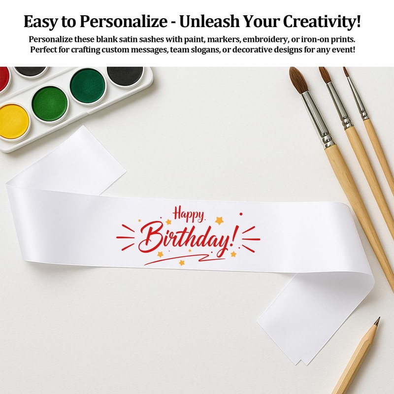 • DIY Your Unique Sash: Personalize these blank satin sashes with paint, markers, embroidery, or iron-on prints. Perfect for crafting custom messages, team slogans, or decorative designs for any event!