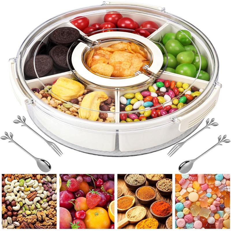 Snackle Box Container Divided Serving Tray with Lid, 6-Compartment Portable Spinning Round Stackable Container, Handle, Spoon and Fork for Veggies, Fruit, Candy, Party Snacks, Nuts, Kitchen Essentials