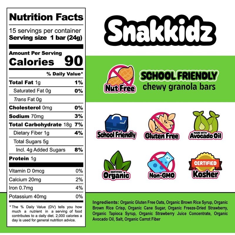 Snakkidz Organic Strawberry Chewy Granola Bar, 15 Count (0.85oz Each), Nut and Allergen Free, Low Sugar, Made with Avocado Oil (15 Bars, Strawberry)