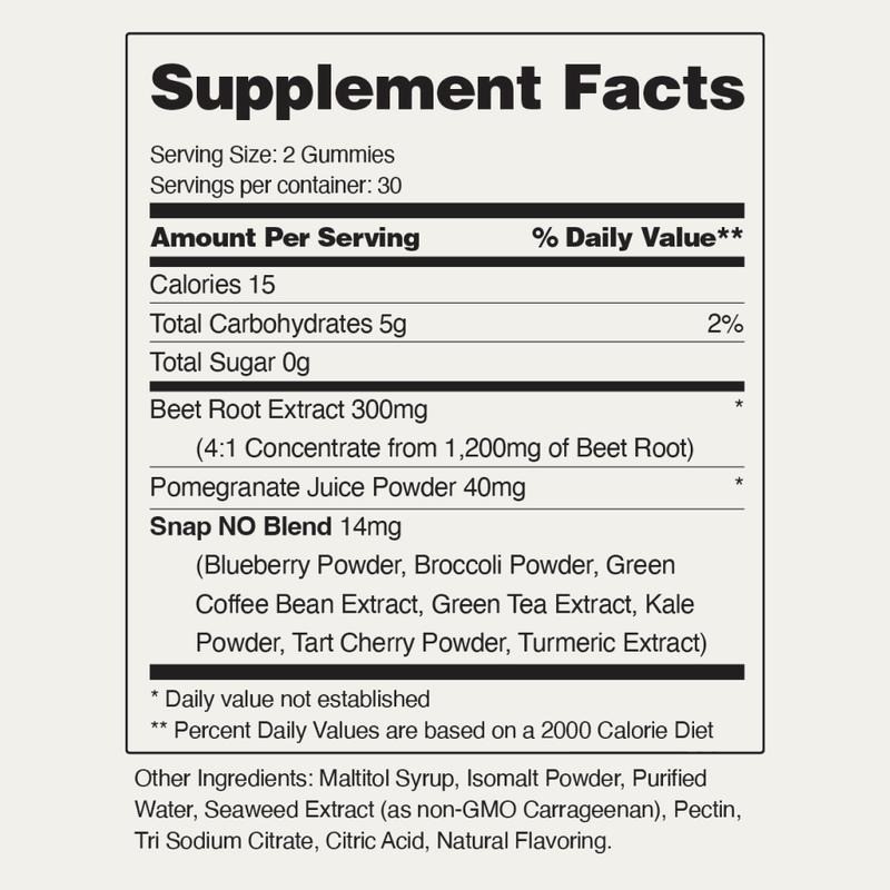 Snap Supplements Nitric Oxide Gummies: Fuel Your Heart, Boost Energy & Support Digestion! 💓 Supports Cardiovascular Health – Packed with the combined power of antioxidants and nitric oxide, our Nitric Oxide Gummies support healthy circulation and blood flow, promoting optimal heart health.* 🍓 Daily Nutrition Boost – With a blend of nutrient-rich fruits and vegetables, these gummies provide a broad spectrum of vitamins and minerals, offering the energy and vitality you need to feel your best every day.* 🌱 Supports Healthy Digestion – Featuring phytonutrients from turmeric, beets, kale, and broccoli, our gummies assist in natural detoxification and support healthy liver function, ensuring your body runs smoothly from the inside out.* ⚡ Supports Energy & Vitality – Infused with extracts of green coffee bean and green tea, our gummies offer a gentle energy boost, helping you power through the day and stay vibrant during your workouts! ✅ Made in an FDA-approved facility 🔬 Third-party tested for potency & purity 🌱 Non-GMO, gluten-free, and vegan-friendly 🇺🇸 Proudly made in the USA Key Ingredients in Nitric Oxide Gummies:·Organic Beetroot – Rich in dietary nitrates and antioxidants, beetroot supports healthy blood pressure, improves circulation, and helps with digestion while protecting cells.*·Pomegranates – Packed with antioxidants, pomegranates protect against oxidative stress and support heart and brain health, helping enhance your longevity and overall well-being.*·Blueberry Powder – Known for promoting a healthy gut microbiota and high antioxidant content, blueberries support digestive health and cellular protection.*·Green Coffee Bean & Green Tea – Energizing extracts that boost energy production, improve focus, and combat stress, ensuring you have the stamina for your active lifestyle.* Directions:Take 2 gummies daily, or as directed by your healthcare professional.Serving Facts:Each bottle contains 30 servings (30-day supply). FAQ:How do Nitric Oxide Gummies support heart health? The antioxidants and nitric oxide in the gummies support healthy blood circulation and blood pressure, promoting overall cardiovascular wellness.*Can these gummies help with energy? Yes! The combination of green coffee bean and green tea extracts gives you a natural, gentle energy boost without the crash, helping you stay focused and active throughout the day.*What other benefits do the ingredients provide? Our gummies are packed with powerful ingredients like pomegranates and beetroot, which offer antioxidant protection and support healthy digestion, liver function, and blood pressure.* Safety Information:Consult with a healthcare provider before use if you are pregnant, nursing, or taking medications.† These statements have not been evaluated by the Food and Drug Administration. This product is not intended to diagnose, treat, cure, or prevent any disease.