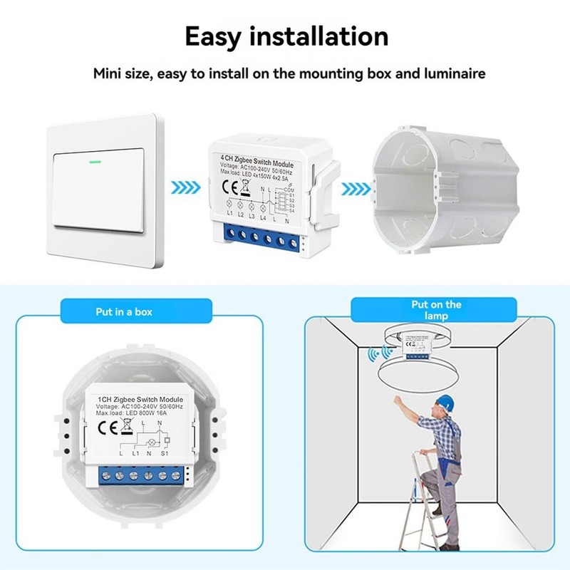 - Compact and Easy to Install: The ultra-mini design can be easily installed into traditional switch boxes, maintaining your home's décor while upgrading to smart technology. Easy to install, perfect for DIY enthusiasts. Note: Compatible with rocker and touch switches, not compatible with reset switches.