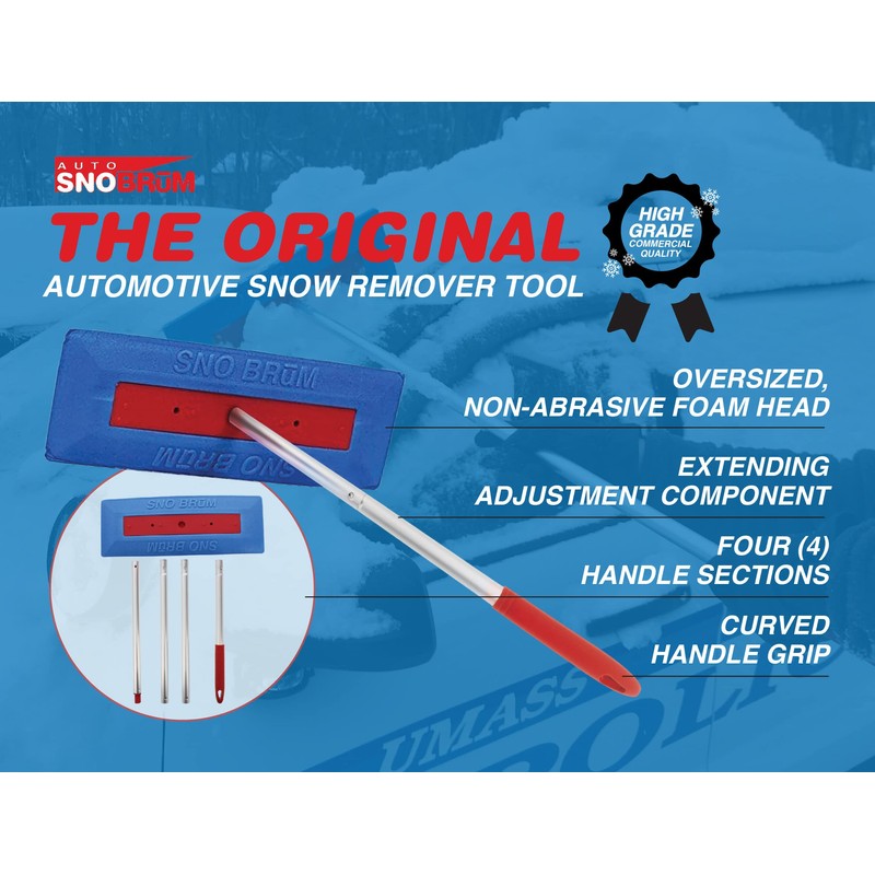 SNOBRUM - Snow Remover for Cars and Trucks - 28 to 63 Inch Automotive Snow Brush with Foam Head and 4 Piece Handle - Made in The USA, Push-Broom Design - No-Scratch Snow Removal - 1 Pack