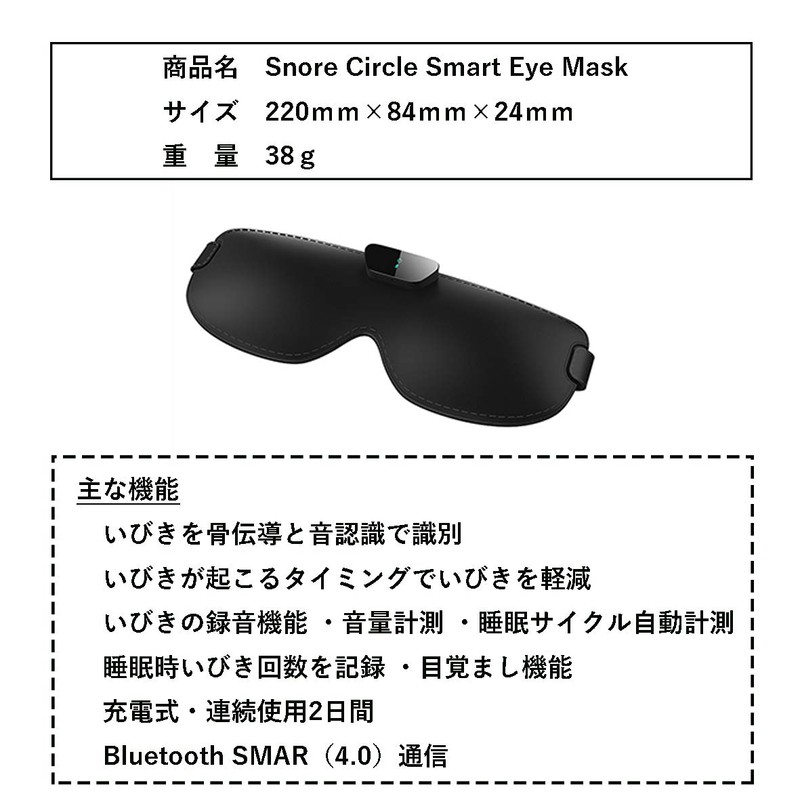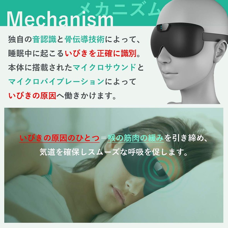 - (Eye Mask Shaped Snoring Reduction Goods) Bones Conduction and Sound Recognition Technology catches sound and vibrations while sleeping. Accurately captures the occurrence of snoring Recognizing snoring, the body emits subtle vibration stimulation of a level that does not interfere with your sleep, and tightens loose throat muscles and directs the airway open to support smooth breathing