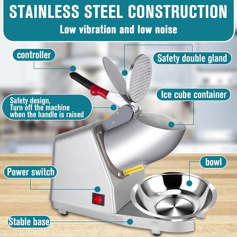 - Easy to operate: The Ice Crusher Ice Shaver features a waterproof on/off switch for easy control, and automatically cuts off the power when the hopper handle is lifted, providing additional safety. Electric Ice Crushers are effortless to operate - just plug in, add ice cubes, and press the non-slip handle to start shaving ice. Snow Cone Maker Machine includes a food grade stainless steel bowl for added convenience
