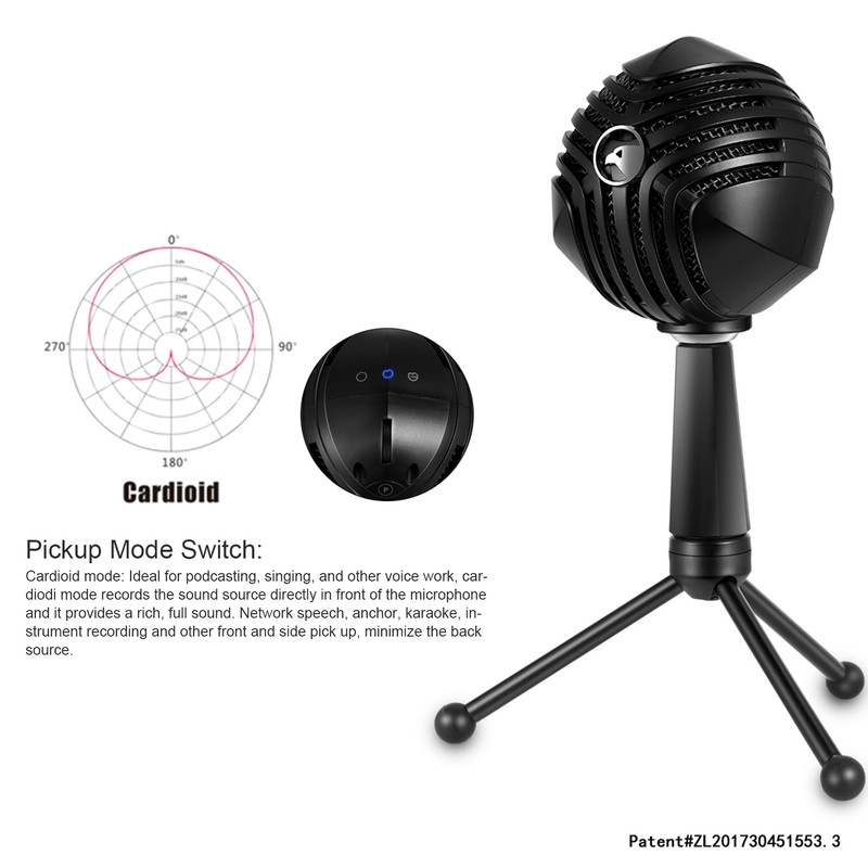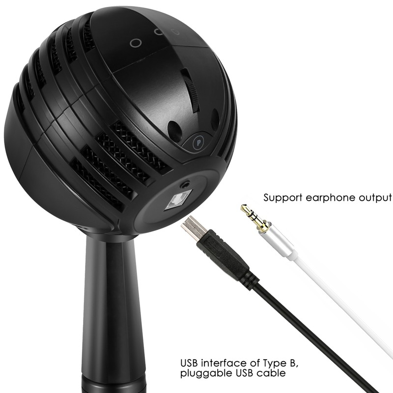 1、Unique Design: This USB gaming microphone adopts unique ball shape and exquisite appearance design. 2、Long Service Life: This USB gaming microphone is made from premium ABS material which ensures long service life. 3、Cardioid Mic Chip: This USB gaming microphone adopts cardioid capacitance mic chip and high density foam that provides CD grade sound effect. 4、Headset Output: This USB gaming microphone with LED indicator light supports one button mute and headset output. 5、Adjustable Angle: Microphone is connected with holder by universal shaft, the pickup angle is flexible and adjustable. 6、Wide Application: This USB gaming microphone possesses detachable and foldable holder. Suitable for online game, webcast and video meeting.