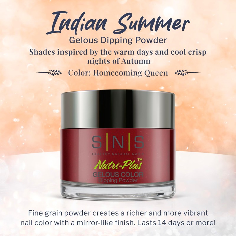 - Warm Tones: SNS Nail's Indian Summer collection is our timeless color palette that is made with fine grain powder that helps create a richer and more vibrant color. Our skin-friendly, low odor formula dries instantly and creates a stunning, mirror-like finish without needing UV light. Color: Homecoming Queen (red, wine, maroon, shimmer)