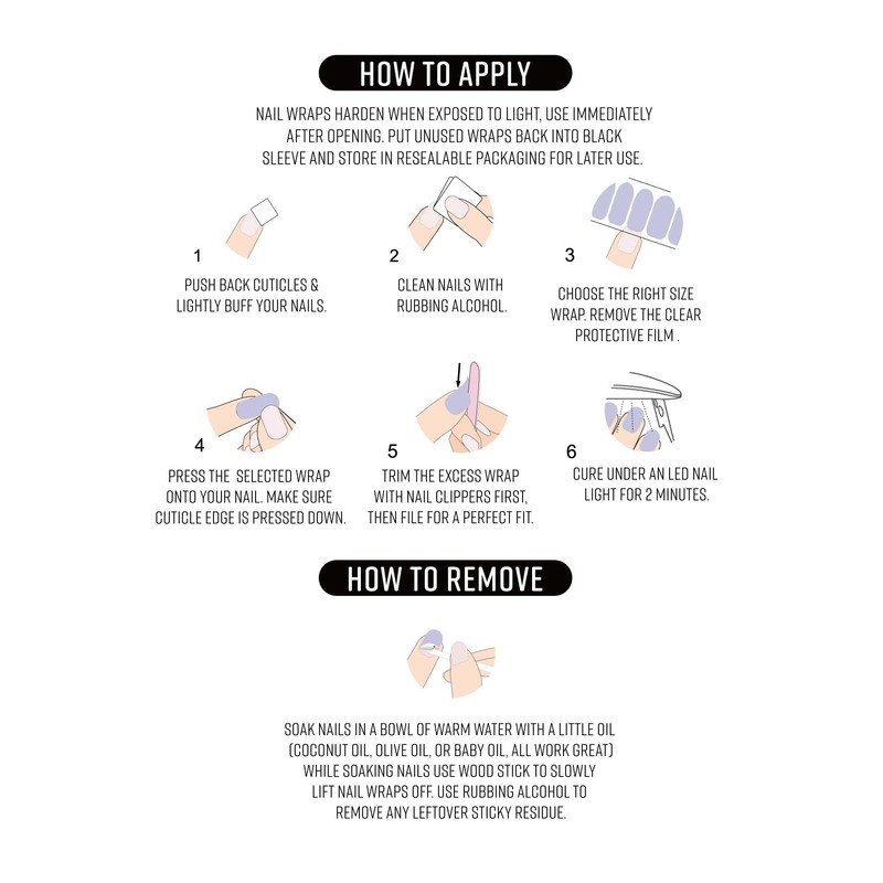 - 4 simple steps to apply. Just prep your nails, apply the wraps, file or clip to fit & cure with an LED nail light.