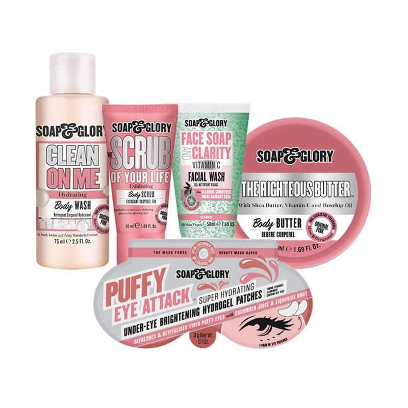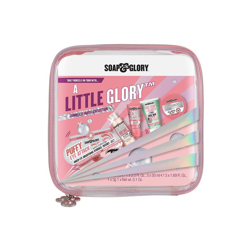 Soap & Glory A Little Glory Gift Set - Puffy Eye Attack, Clean on Me, Scrub of Your Life, Face Soap & Clarity and The Righteous Body Butter - Holiday Gift Sets in Travel Size (5 Count)
