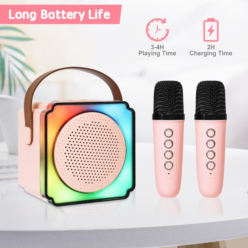 Perfect karaoke experience for children: This karaoke machine for children is specially designed for little singers and contains two microphones and a powerful Bluetooth stereo system. Your kids will love singing their favourite songs with this mini karaoke machine that provides hours of fun. Ideal for birthday parties or game dates, it promotes creativity and confidence of young talents.