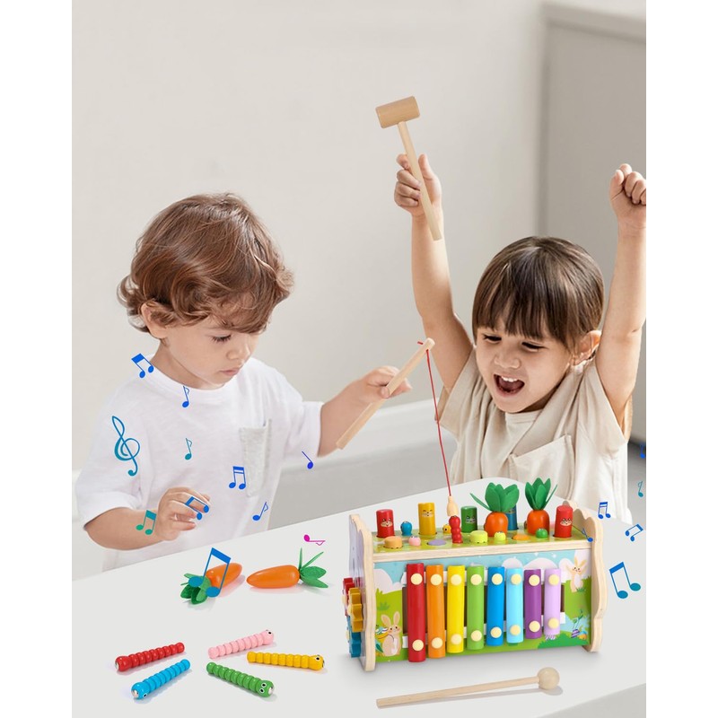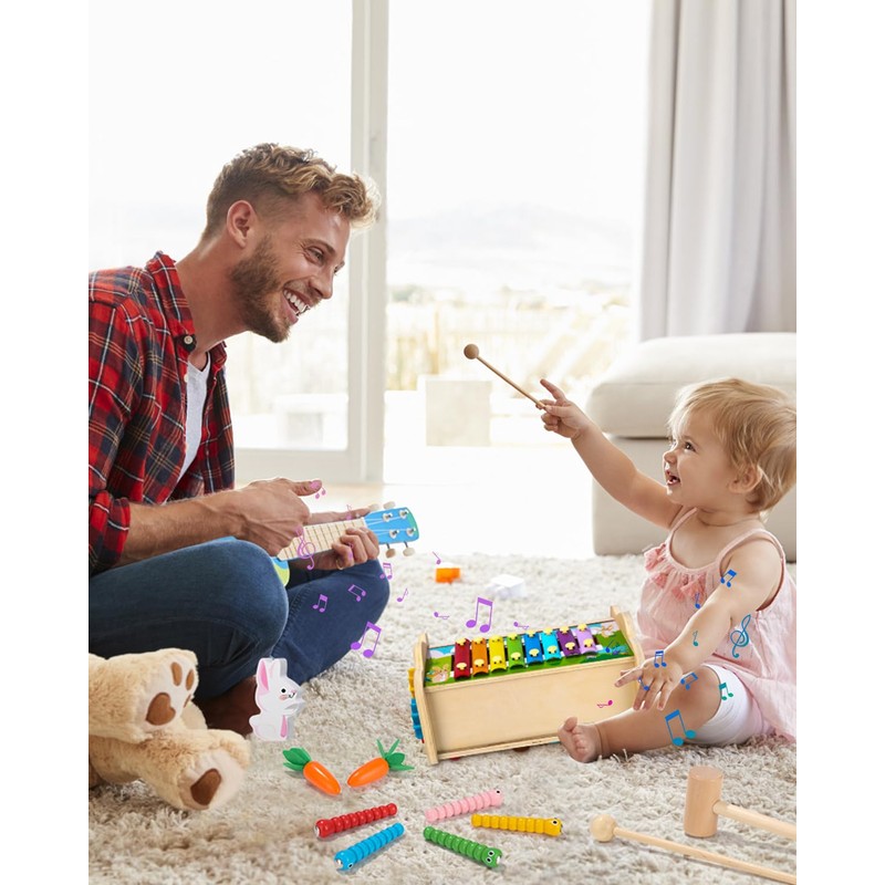 SOBEAU 8 in 1 Wooden Toy Hammer Game from 1 Year, Wooden Montessori Music Toy, Xylophone, Carrot, Fishworm, Gears, Gift Toy for Children Aged 1 2 3 4 5 6 7 Years