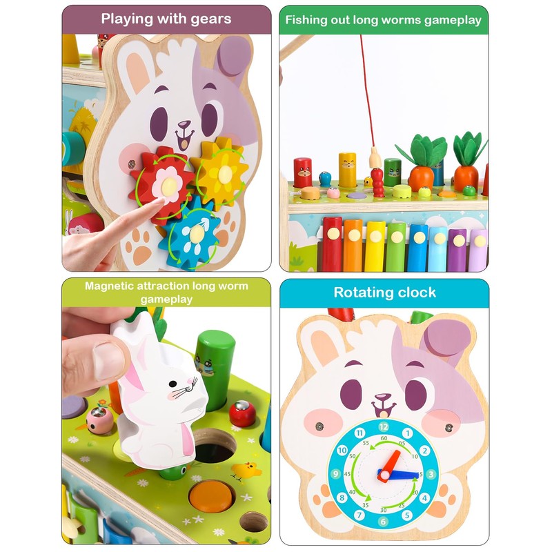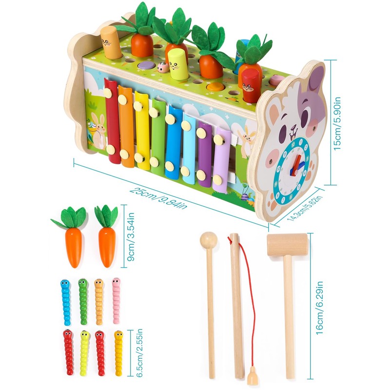 - 8-in-1 Montessori wooden toy: 8-in-1 wooden toy includes pulling radishes, tapping underground mice, magnets that attract insects, catching insects, watches, harps, gears and animal mazes. A very rich gameplay that allows children to play with toys to their heart's content and joy.
