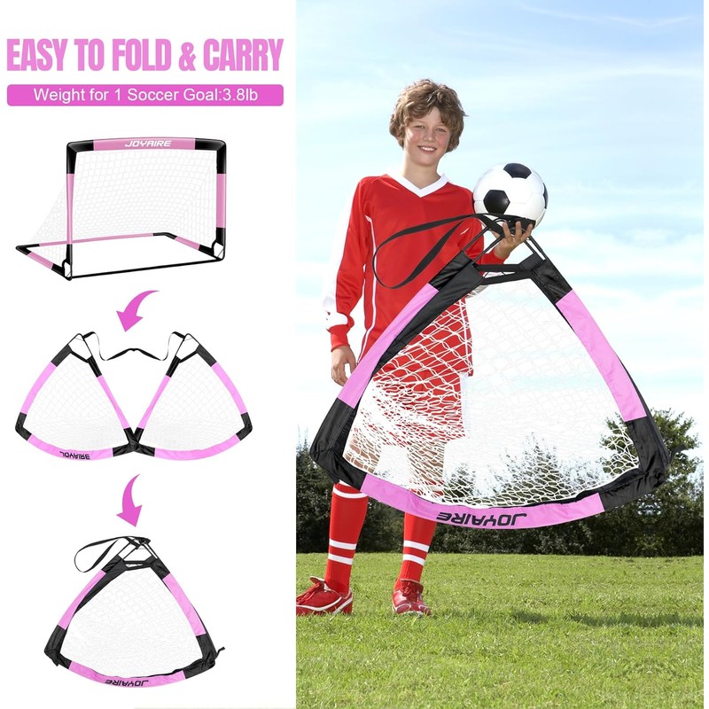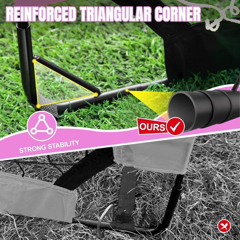 - "Durability & Quality Above All Else" : 4x3 ft large pop up soccer goals set of 2. We have upgraded the kids soccer goal, including 450D thick Oxford cloth, triangular corner design, 10mm fiberglass pole, and 5-layer polyester fiber soccer net, which exceeds the standard 3-layer and is more durable and sturdy. Long term use around the clock without losing stability, even if kicked hard, will not damage the soccer goal. Use now to keep your child away from addiction to computers and phones