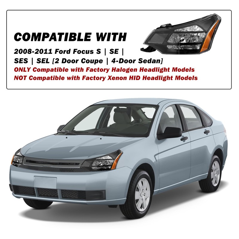 - 🚗【FITMENT】Headlights Assembly for 2008-2011 Ford Focus S SE SES SEL [2 Door Coupe | 4-Door Sedan]. NOT for Factory Xenon HID Headlight Models. ONLY for Factory Halogen Headlight Models. Bulbs are not included. High / Low beam bulb type: H13; Signal light bulb type: 3157; Side marker bulb type: 168.