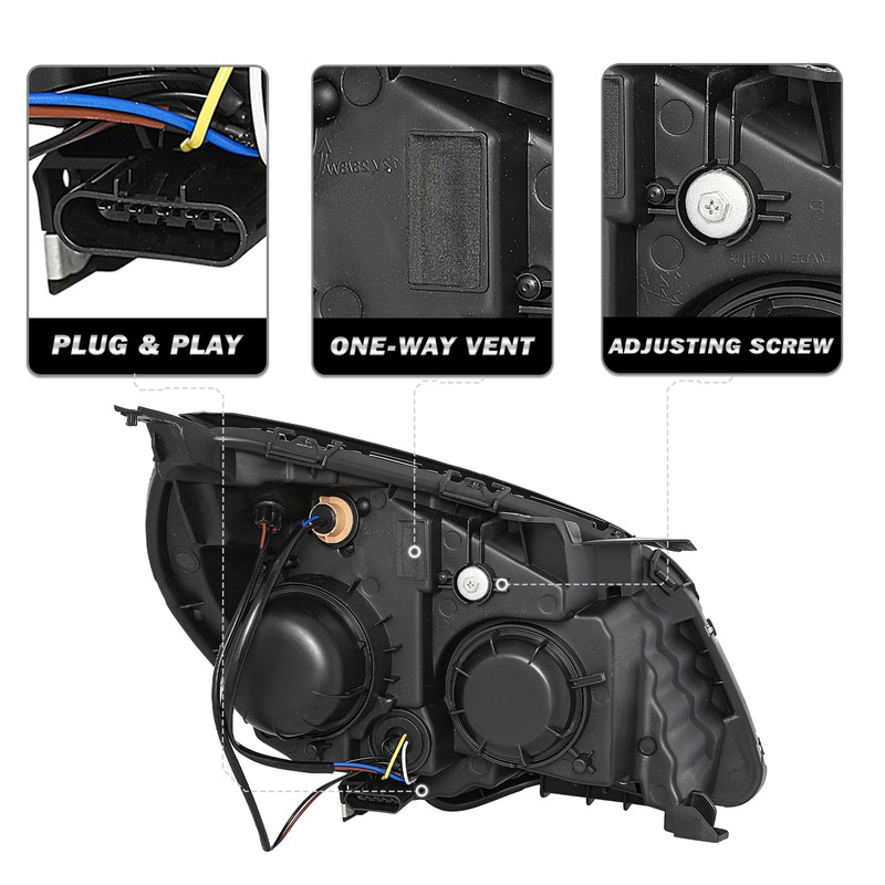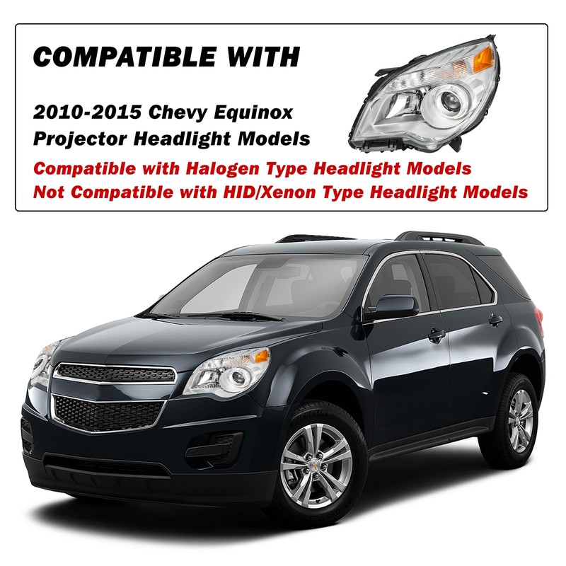 - đăFITMENTăHeadlights Assembly Compatible with 2010-2015 Chevy Equinox Projector LS/LT/LTZ Model. Only fit for w/ Factory Halogen Headlights Models. High Beam: 9005; Low Beam: H11; Turn Signal Light: 7444NA. Side Marker Light:168.