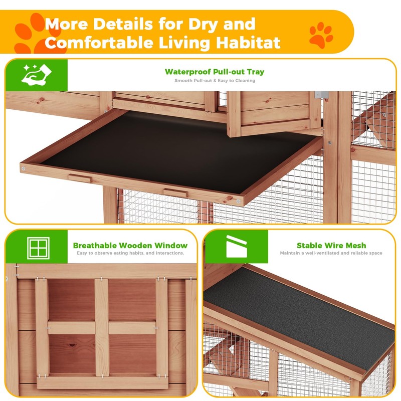 - 【Waterproof Chicken Coops】The outdoor chicken house is fully covered with waterproof roofs, which will not leak rain and are more useful than other materials. The elevated fence design keeps the main coop and nesting boxes off the ground, which not only helps with ventilation, but also allows the coop to keep dry. Tips: please wear gloves during the assembly of this product.
