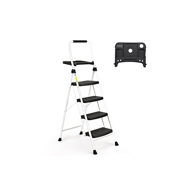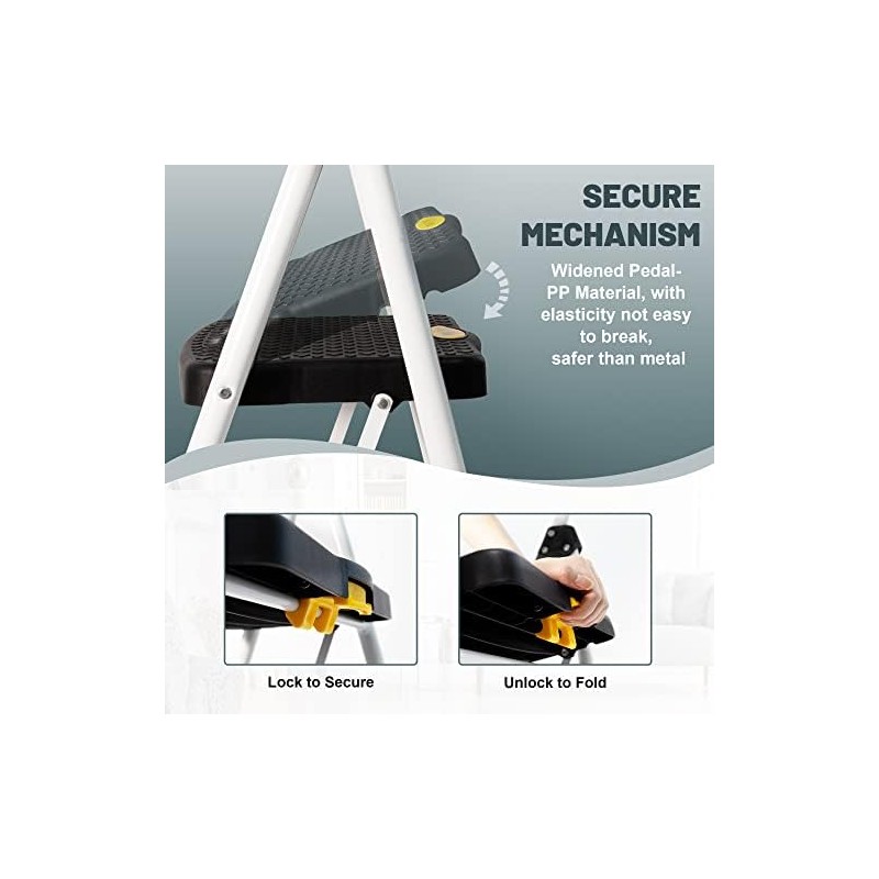 - Anti-slip & Stability: SocTone foldable 4-step ladder added metal support, thickened the steel frame, and used a safety lock design to fix the ladder. When you use it, push down the top pedal until the safety locking mechanism is automatically locked in place. Wide pedals with a non-slip rubber pattern, Coupled with a soft sponge-covered handle. All designs will bring you a comfortable and stable climbing experience.