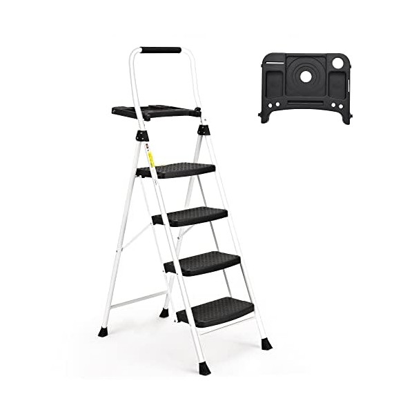 SocTone 4 Step Ladder, Folding Step Stool with Tool Platform, Sturdy& Portable Steel Ladder for Adults, 330LBS Capacity Ladder for Home Kitchen Pantry Office