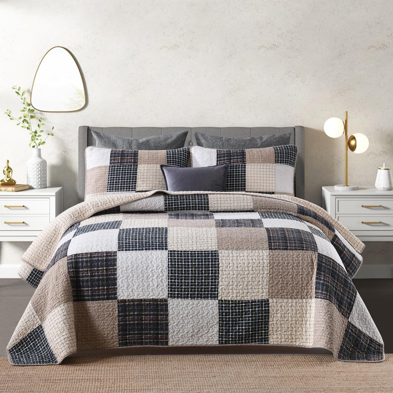 SOElinens Quilts King Size - Real-Patchwork Plaid Design King Quilt Set with Matching Shams, 3 Pieces 100% Cotton Lightweight Rustic Cabin Lodge Bedspread for All Season, Brown/Beige/Charcoal