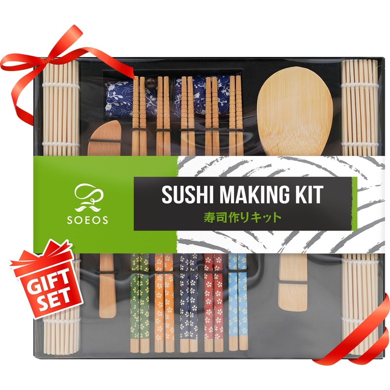 Soeos Beginner Sushi Making Kit, 10 Piece Bamboo Sushi Kit with 2 Bamboo Rolling Mats, 5 Pairs Chopsticks, Paddle, and Spreader, All Natural, Sushi Making Kit Gift Set, Sushi Maker Kit, Sushi Maker.
