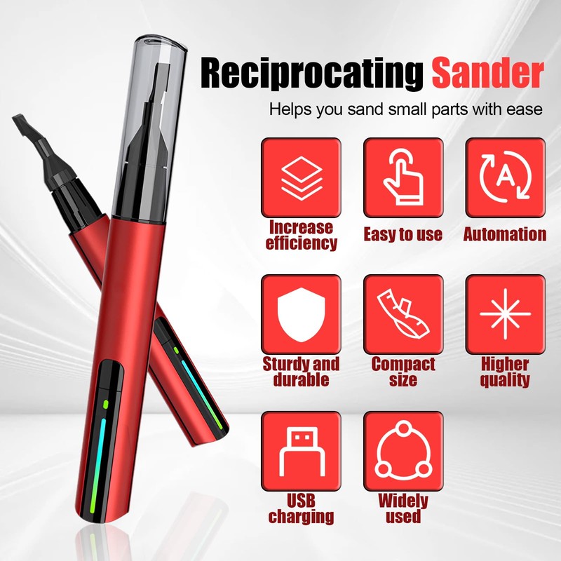 - Mini Reciprocating Sander: This USB fast-charging electric sander comes with 8 specifications of high-quality nylon sanding heads and 12 types of wear-resistant self-adhesive sandpaper. Various shapes of sanding heads and various precision sandpapers can well meet the needs of DIY craft enthusiasts.