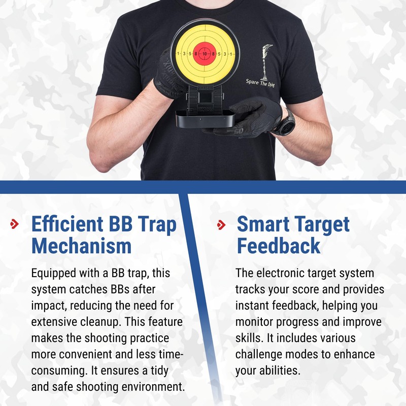 - MULTIPLE CHALLENGE MODES: Test your skills with various challenge modes included in the airsoft target practice system. The BB catcher target has versatile challenge modes to keep your training sessions fresh and engaging.