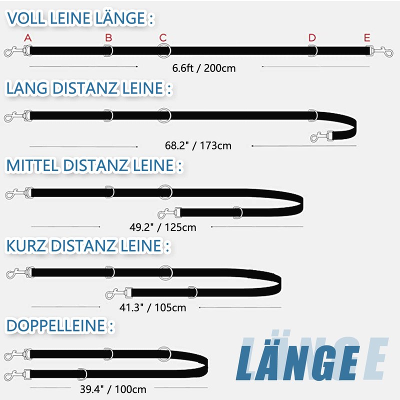 - 7-in-1 multifunctional dog lead: Wear it over the shoulder to walk freely. Use one hand to hold 2 dogs at the same time. Short dog lead provides control for the dog on busy roads or when visiting the vet. When you go jogging running training, you have a dog lead that is long enough to give more freedom. Flexible quick release of the leads can be freely rotated 360° to minimise tangling of the pull rope