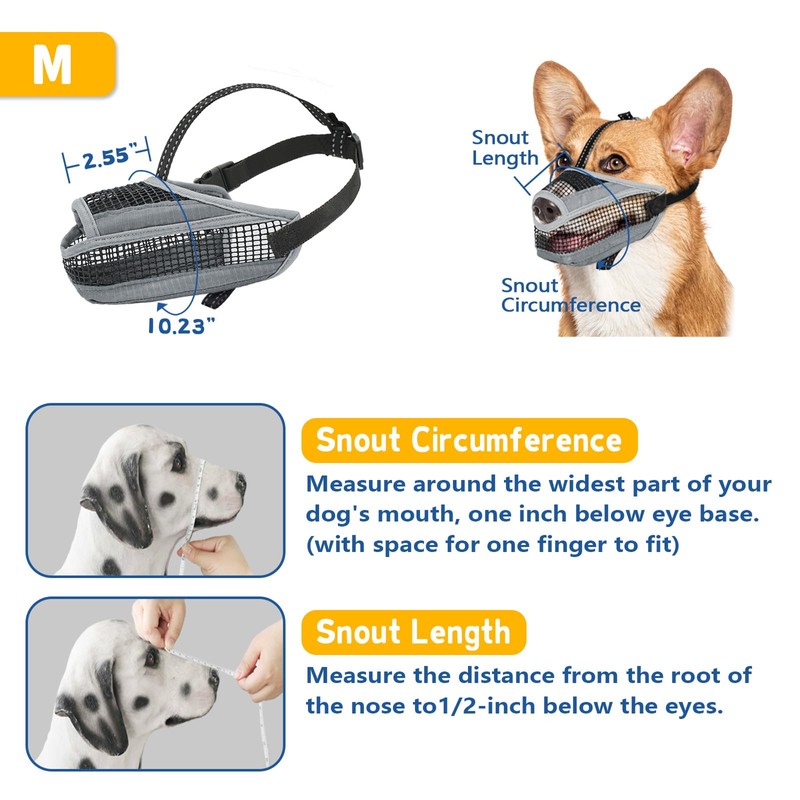 - Size Guide & Multi-Scenario Use: Size M- Works for mouth circumference less than 9.84", and snout length greater than 2.55". Pre-Use Nail Trimming - Smart dogs will try to stick nails through the mesh hole to take off or damage the muzzle. Versatile Applications - Perfect for walks, car rides, training sessions, or post-surgery recovery