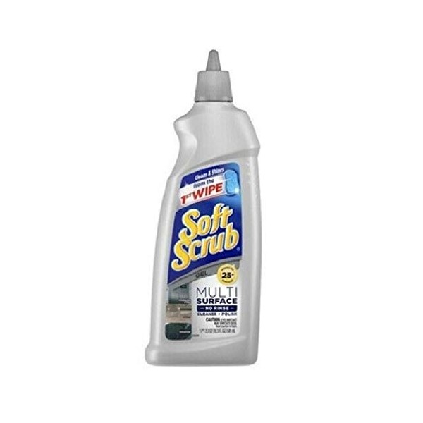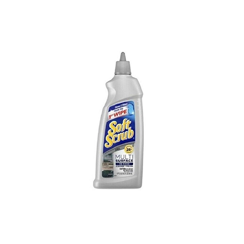 Soft Scrub Multi-Surface cleaner and polish work on over 25 surfaces without rinsing required. Specially formulated to care your most delicate surfaces, this multi-surface cleaner penetrates dirt and grime to clean and shine from the first wipe! This gel formula removes water spots, soap scum, and fingerprints from stainless steel sinks and appliances. Food and spills are wiped away on any glass or ceramic cooktop (but apply to a cool or cold surface, never a hot cooktop!). For granite and marble, this cleansing gel safely removes grease, grime and surface stains. Surfaces include Acrylic, Black Plastic, Brick, Bright Brass Finish, Brushed Nickel Finish, Ceramic, Chrome, Copper, Cork, Glass, Glass Tile, Granite, Indoor Rubber, Laminate, Marble, Melamine, Metal Backsplash, Mirror, Natural Stone (Venatino), Oak, Outdoor Rubber, Painted Wallboard, Plexiglass, Polycarbonate, Porcelain, Prime Metal, PVC, Sandstone, Satin Aluminum Finish, Satin Nickel Finish, Stainless Steel, Travertine, Vinyl, and more! To use apply the product directly onto the surface or onto a damp sponge or cloth. Rub. Wipe clean with a sponge or paper towel. For stubborn stains allow product to penetrate for up to one minute.