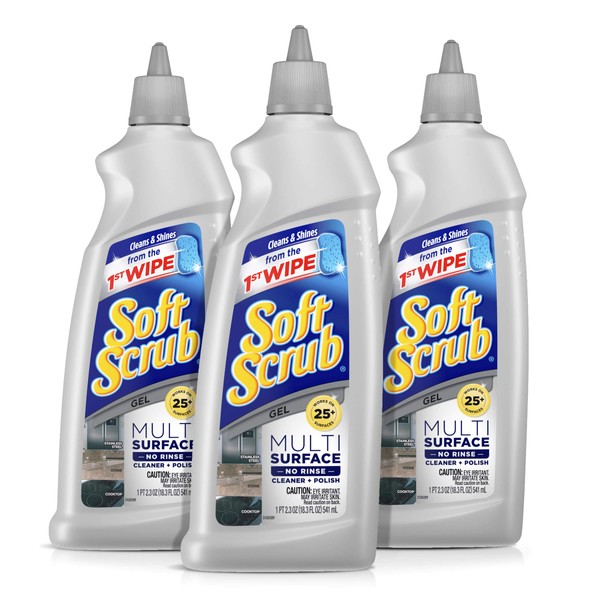 Soft Scrub Multi Surface cleaner and polish works on over 25 surfaces without rinsing required. Specially formulated to care your most delicate surfaces, this multi surface cleaner penetrates dirt and grim to clean and shine from the first wipe! This gel formula removes water spots, soap scum, and fingerprints from stainless steel sinks and appliances. Food and spills are wiped away on any glass or ceramic cooktop (but apply to a cool or cold surface, never a hot cooktop!). For granite and marble, this cleansing gel safely removes grease, grime and surface stains. Surfaces include: Acrylic, Black Plastic, Brick, Bright Brass Finish, Brushed Nickel Finish, Ceramic, Chrome, Copper, Cork, Glass, Glass Tile, Granite, Indoor Rubber, Laminate, Marble, Melamine, Metal Backsplash, Mirror, Natural Stone (Venatino), Oak, Outdoor Rubber, Painted Wallboard, Plexiglass, Polycarbonate, Porcelain, Prime Metal, PVC, Sandstone, Satin Aluminum Finish, Satin Nickel Finish, Stainless Steel, Travertine, Vinyl, and more! To use apply product directly onto surface or onto a damp sponge or cloth. Rub. Wipe clean with a sponge or paper towel. For stubborn stains allow product to penetrate for up to one minute.